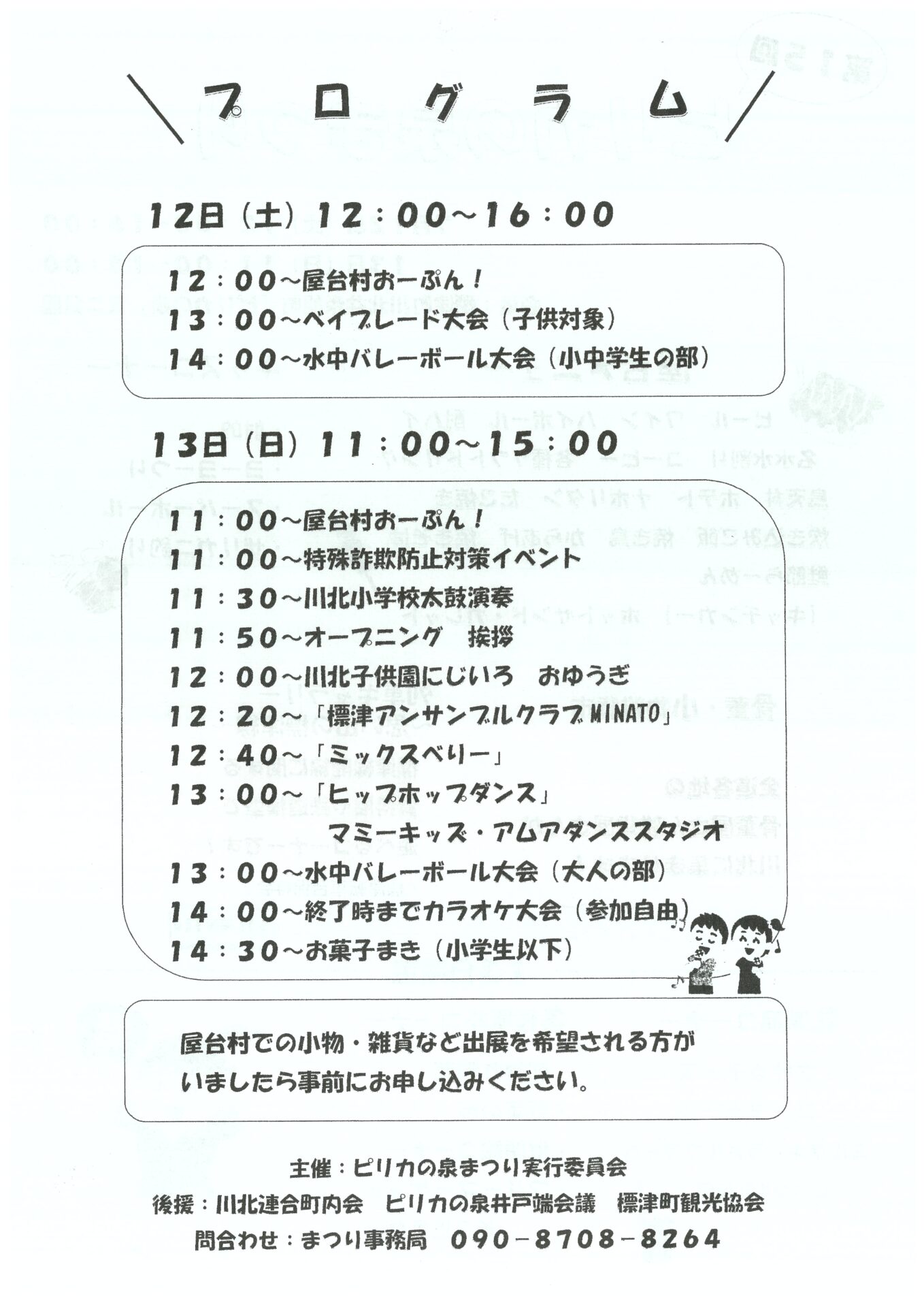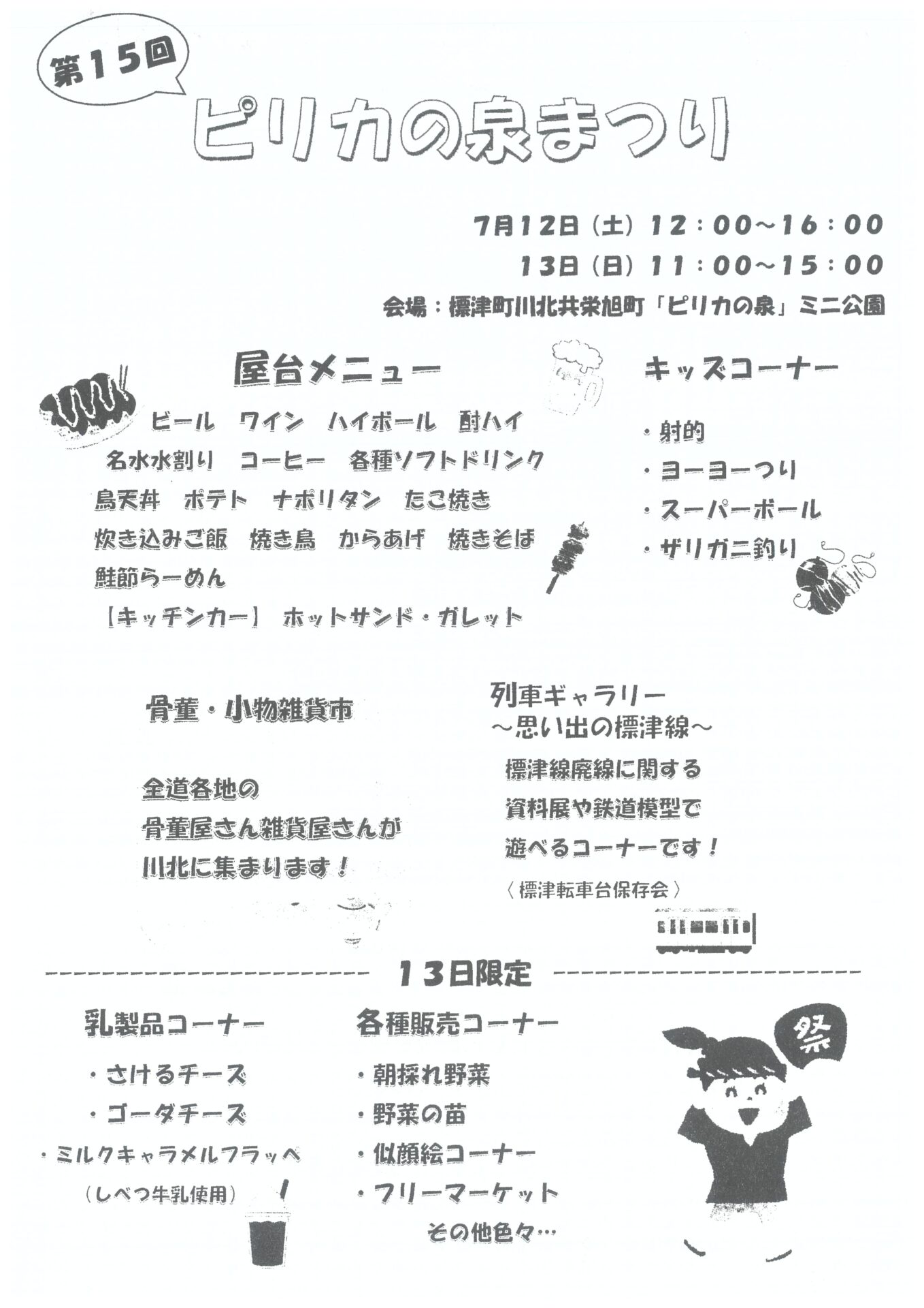 令和7年7月12日(土)・13日(日)の2日間、「ピリカの泉」ミニ公園(標津町川北共栄旭町)にて、第15回ピリカの泉まつりが開催されます!