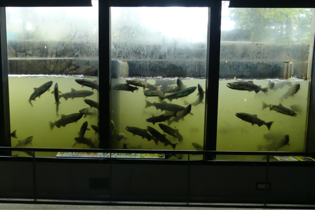 秋鮭が遡上をするこの時期、サーモン科学館の魚道水槽は川とつながり、鮭たちが強く泳ぐ姿を見ることができます。また、期間限定で科学館裏手にある「観覧橋」を開放しており、橋の上から海から川へ遡上している鮭たちを上から望むことができ、サケの生命力をぜひ体感してください!