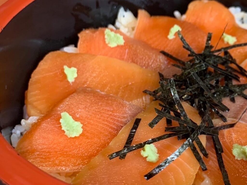人気シリーズ「ちび丼セット」の中でもイチオシなのがちびサケ鉄火丼セット。鮭は地元産ものを使い、ルイベにして自前のタレで軽く漬けています。温かいご飯の上に乗せることで、ルイベが溶けてちょうどよい食感に!ラーメンもついてボリューム満点です!