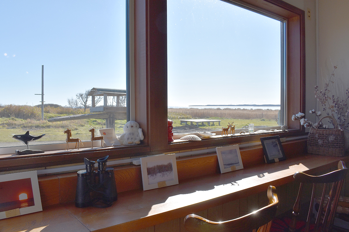 アイヌ語で小さな木の実のなるところを意味する「ポンノウシ」と呼ばれる場所に位置し、野付半島の自然豊かな景色を、標津の食材と一緒に楽しむことができます。運が良ければシマエナガなどの小鳥や白鳥、黒雁、丹頂鶴など季節により様々な鳥を観察することも。