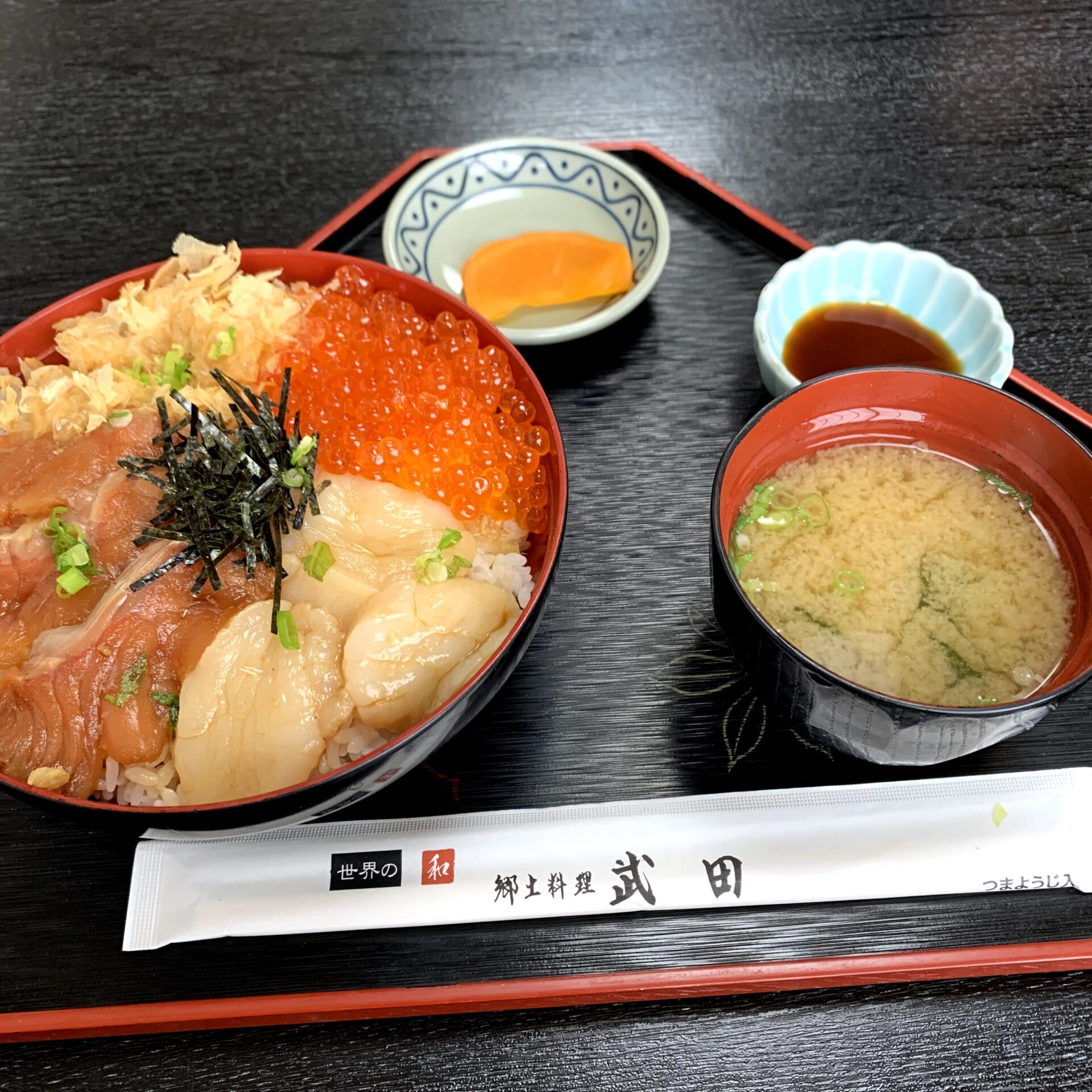 鮭料理・いくら丼・ホタテ料理を提供する「郷土料理 武田」。地元の新鮮な魚介類を堪能できる、言わずと知れた名店です。
