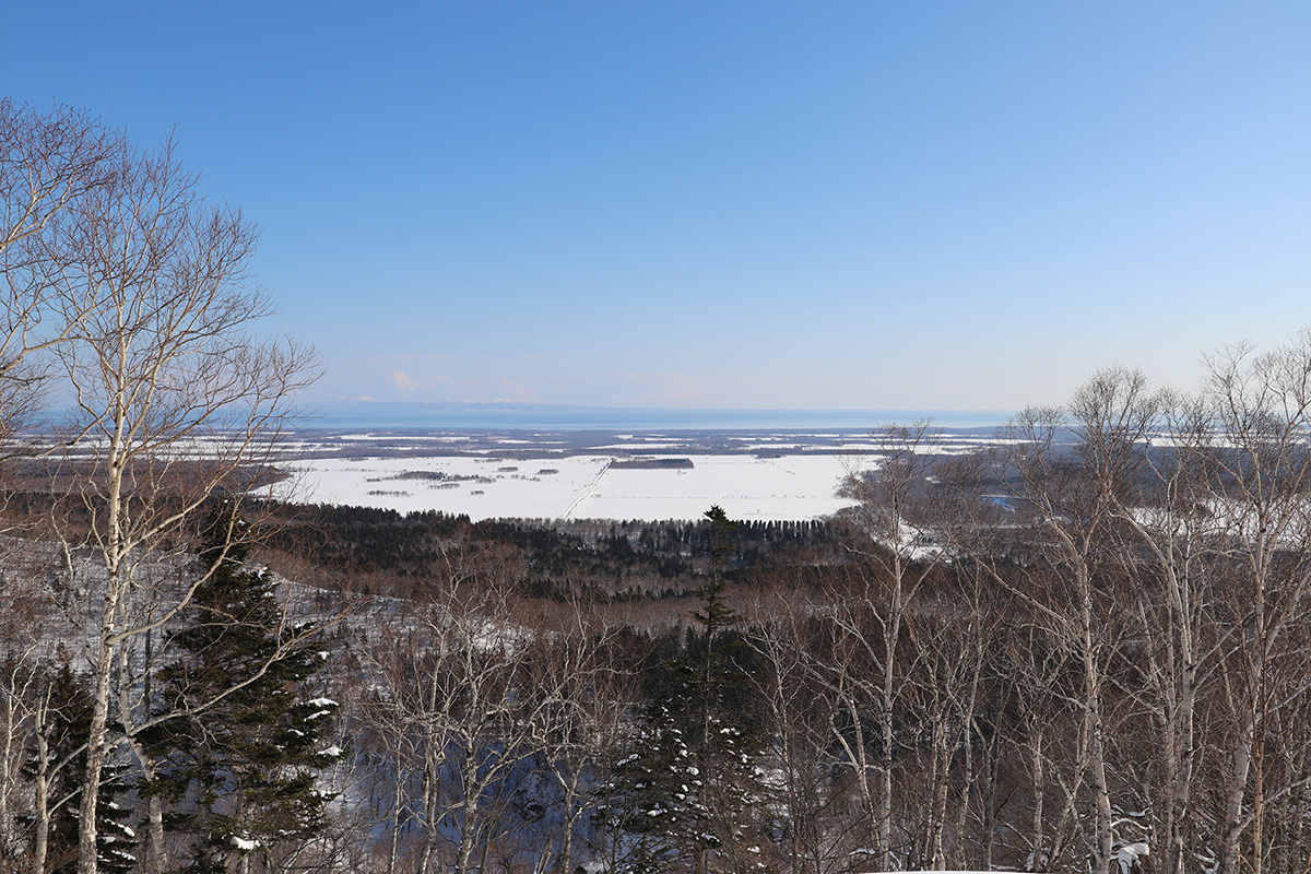 山でありながら海までの距離が18kmほどの場所に位置し、ゲレンデの頂上から視線を上げると国後島と野付半島が。
