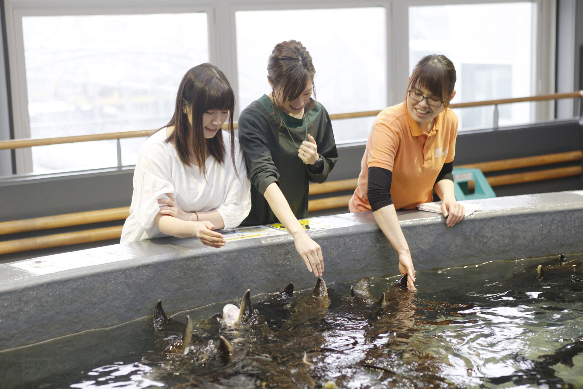 チョウザメに指を“食べられる”人気の体験です。 チョウザメは歯がない魚なので、噛まれても大丈夫! いつでもどなたでもチャレンジできます。