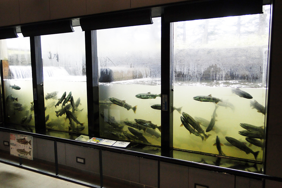 季節ごとに違った姿を見せてくれるサケ。稚魚から遡上、産卵の様子まで間近で見られる「サケの水族館」です。